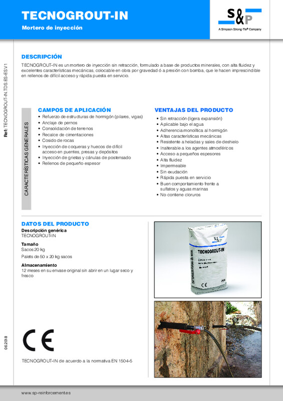 S&P Tecnogrout-IN es un mortero de inyección sin retracción, formulado a base de productos minerales, con alta fluidez y excelentes características mecánicas, colocable en obra por gravedad ó a presión con bomba, que le hacen imprescindible en rellenos de difícil acceso y rápida puesta en servicio.